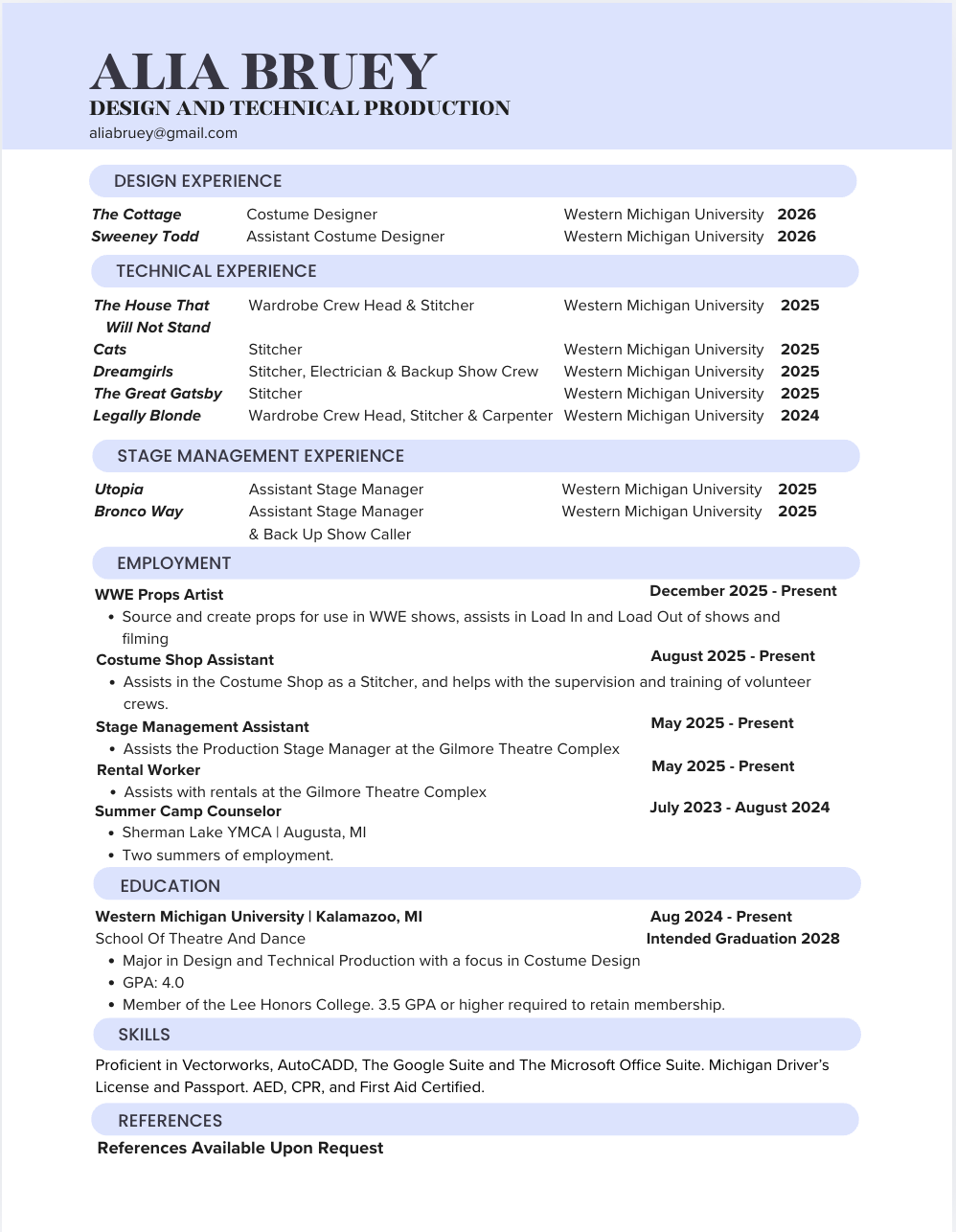 I am an artist from Southwest Michigan. My disciplines are Costume Design and Construction, Stage Management, Props, Photography, and Fine Art. I am currently pursuing my BFA in Theatre Design and Technical Production from Western Michigan University, I have an intended graduation date of May, 2028. My life goal is to bring joy and catharsis to others through my work in the entertainment industry.